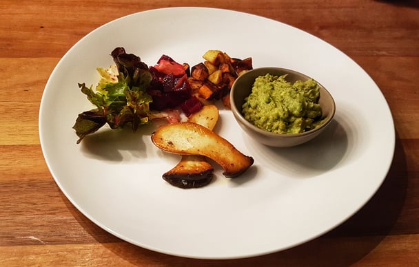Bratkartoffeln mit Kräuterseitlingen grünem Salat und Cuacamole.